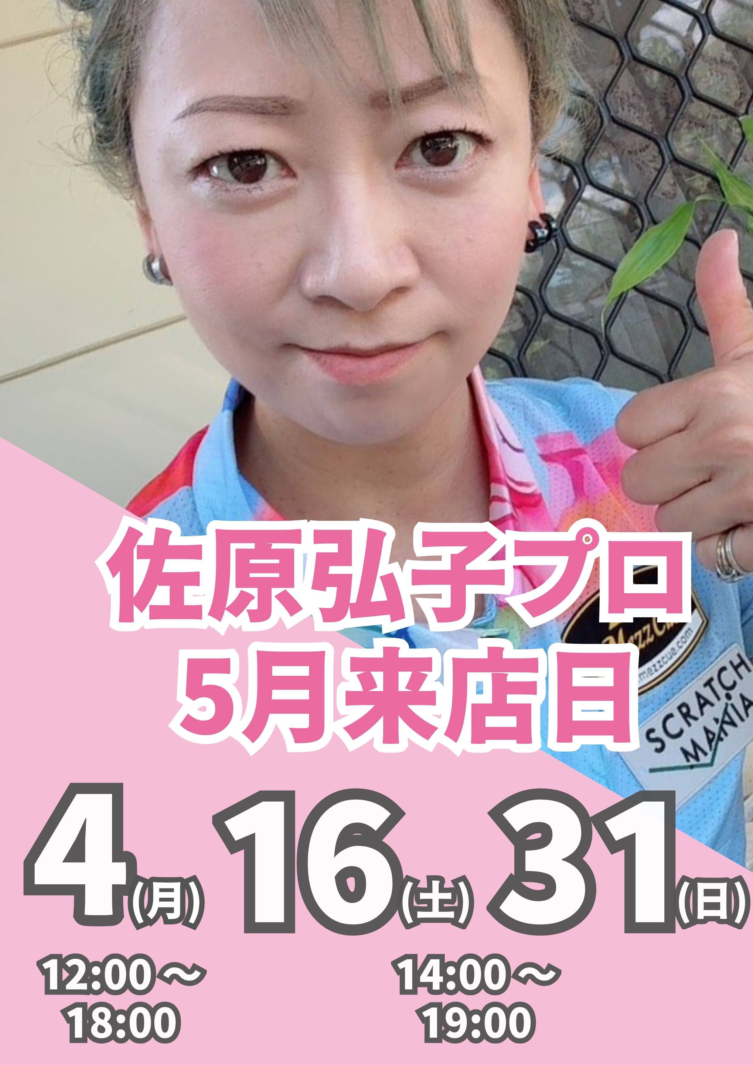 佐原弘子プロ2026年5月の来店日のご案内です。会員様はもちろんのこと、非会員のお客様もご利用可能となっておりますので、よかったら遊びに来てください!